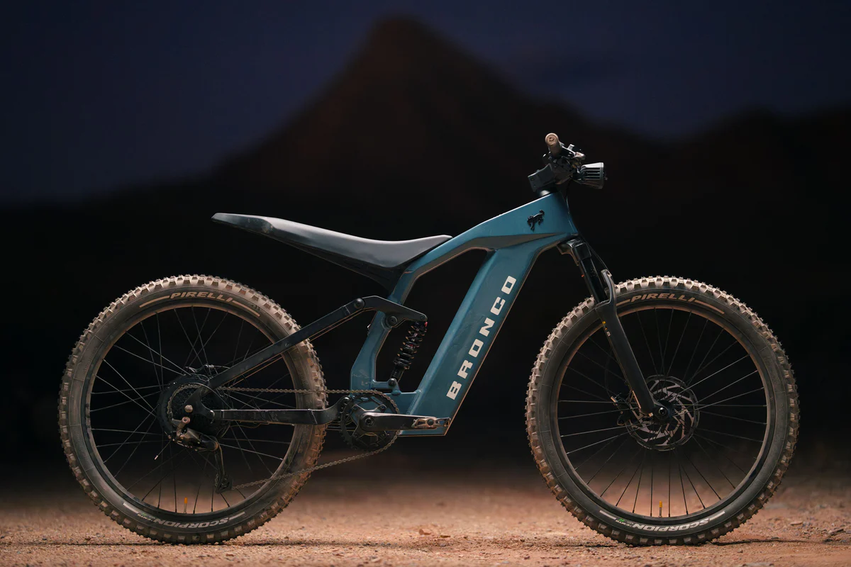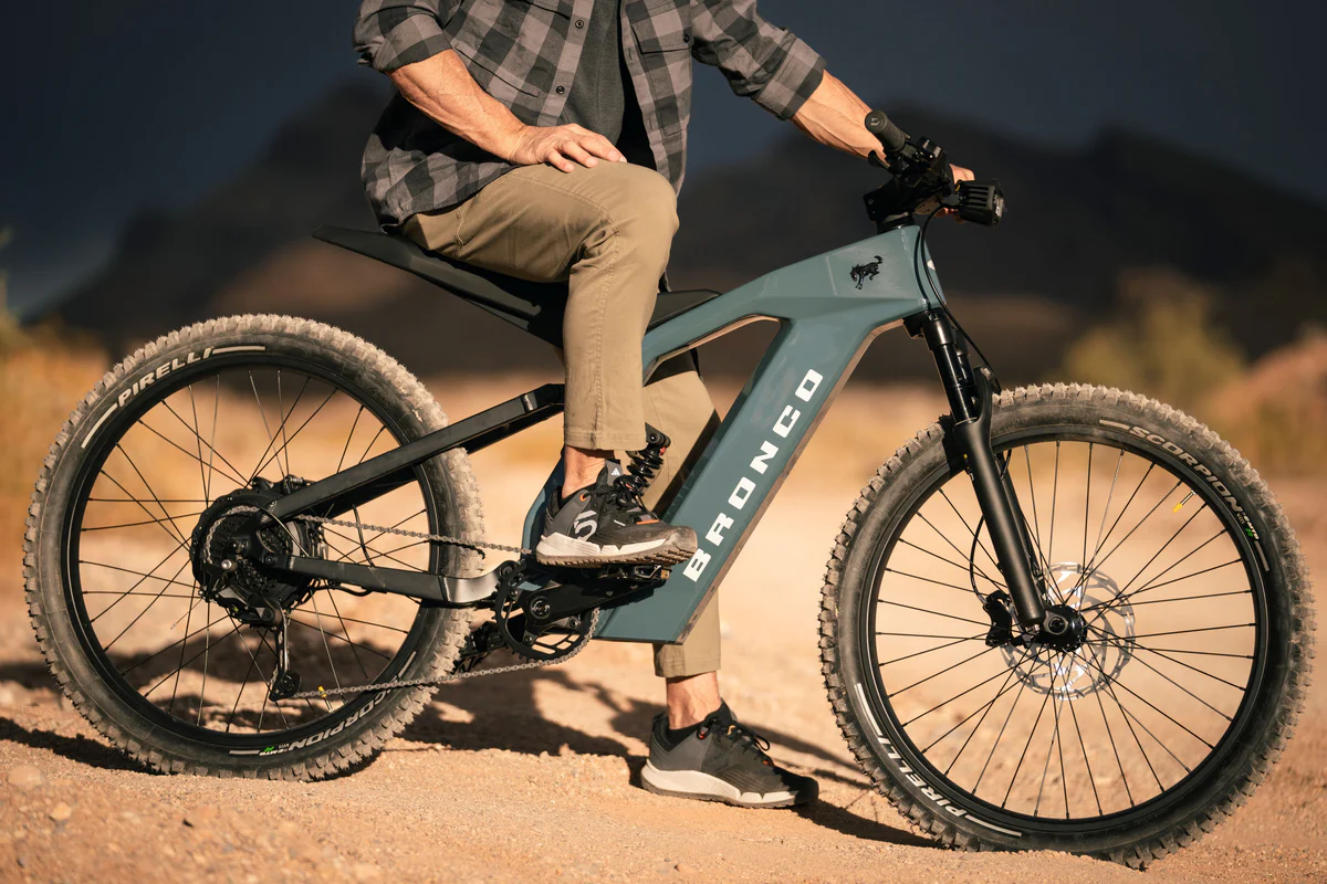 Genuine Area 51 Ford Bronco paintwork with a red starter button ensures riders know they're on a Ford electric bike. Not just any Ford; and the legendary badge proudly declares that this ebike is a Bronco.